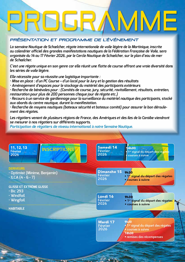 La 34° SEMAINE NAUTIQUE INTERNATIONALE DE SCHOELCHER se déroulera du 14 au 17 Février 2026 .